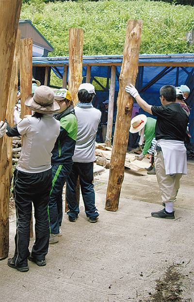 体験型では、市で進められる里地里山自然環境研究の実践教育として、杉の間伐材で薪やチップを作った。語り合い型の幼小中合同グループ協議では「周りの様子を聞く中で、問題解決のきっかけが見つかった」と話す参加者もいた。