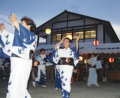 この日は広場で太鼓連による演奏のほか、フラダンスや盆踊り、飛び入り参加可能なカラオケを開催。盆踊りには、東地区婦人会など地元のグループが参加したほか、子どもらが踊る姿も見られた。また、模擬店では飲食物を販売。多くの人が夏の夜を楽しんだ。