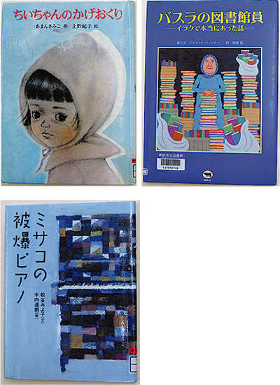 本棚に並ぶのは、第二次世界大戦時の『ちいちゃんのかげおくり』『かわいそうなぞう』『マブニのアンマー』『クラシンスキ広場のねこ』や今の世界での出来事『アフガニスタン勇気と笑顔』『バスラの図書館員』、平和を考える『せかいでいちばんつよい国』『へいわのうた』など約40冊。8月14日に市文化会館でも演奏を行った”被爆ピアノ”についての『ミサコの被爆ピアノ』も置かれている。