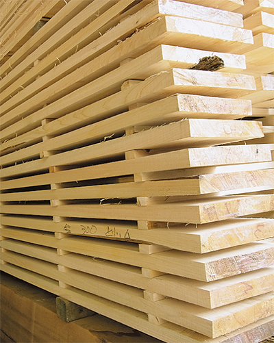 切り出された檜は、枝葉を付けたまま山中で乾燥させる「葉枯らし」の工程を3カ月ほど経て、三重県と神奈川県内の工場で大まかに製材。現在は三重の工場で、来年中ごろに予定される出荷時期まで、天然乾燥が行われている。じっくりと時間をかけて含水率を下げる天然乾燥は、機械乾燥と比べ色・ツヤ・香りが良い材料に仕上がるという。