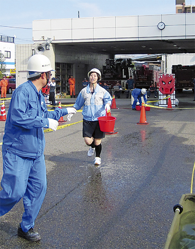 バケツリレーで初期消火競う