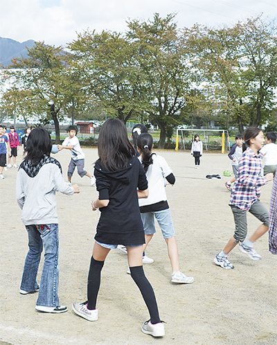 交流授業当日は、クイズや椅子取りゲームなどのレクリエーションのほか、各学校やクラスの紹介発表が行われた。はじめは各クラスごとに固まりがちだった子どもたちも、言葉を交わす中で段々と打ち解け、後半に校庭へ移動する頃には、1つのクラスのようなまとまりを見せていた。