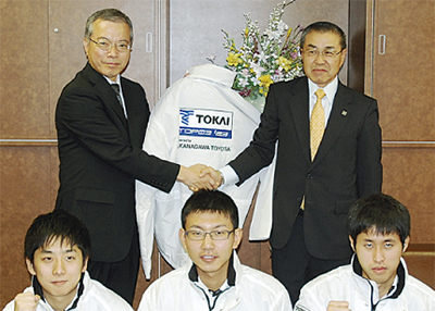 高橋正夫常務取締役(写真後列右)から同大学の平岡克己工学部長(写真後列左)と共にブルゾンを受け取った学生代表らは「チーム名と社名、誇りを背負って頑張りたい」と話した。