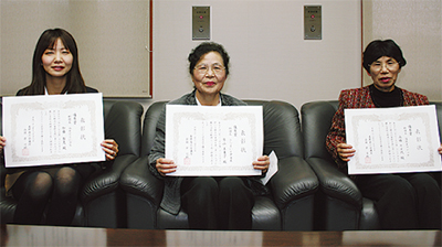 表彰されたのは高橋キヌ代さん(入船町/応募料理・落花生コロッケ)、草山美重子さん(平沢/同・さつまいも伊達巻)、加藤梨恵さん(今泉/同・みそピーにぎり)。