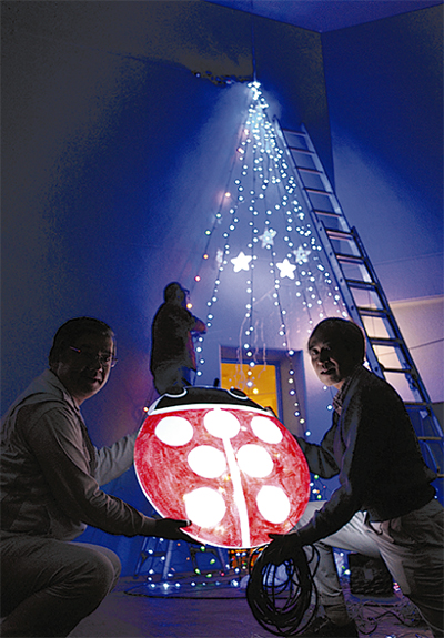 これは南が丘地区住民の交流の場にしようとウェルシー自治会と秦野南が丘もくせい西住宅管理組合が共同で毎年実施している。住民有志がLEDを使い、クリ スマスツリーをイメージして装飾した。また今年は同住宅が20周年を迎えたことを記念して、全7棟の建物をイメージしたナナホシテントウの電飾を製作し た。参加者は「地域コミュニケーションの絆となれば」と話している。