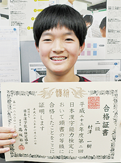 11月に行われた漢字検定で、村澤一樹君(南が丘小6年)が見事2級合格を果たした。