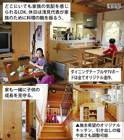 家族のコミュニケーションを大切にする父親目線での間取りやこだわりの造作キッチン、家事動線、コンセントの位置など、とにかく細かい箇所まで住みやすさに配慮している。「施主のいいなりでは不親切だと思う。プロとして良いものを提案してあげたい」。