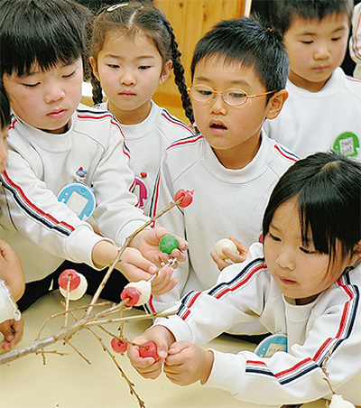 子どもたちは緑、白、ピンク色をした団子粉から好きな色を選んで、「幸せになりますように」と小さな手で一生懸命丸めた。その後、ゆで上がった団子を一つずつ丁寧に枝に刺した。