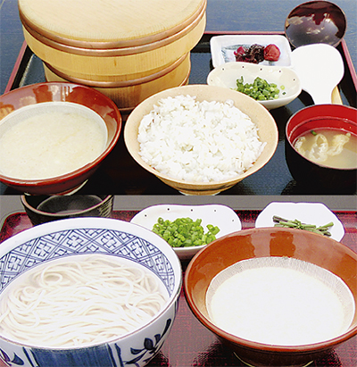 こだわりの麦飯や自家打ち(五分打ち)の中細麺でコシの強さが自慢のそばも、とろろ汁の味わいを引き立てる。たっぷりかけて楽しんでほしい。