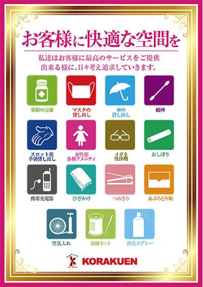 同店は2月29日(水)にリフレッシュオープン!一部床の貼り替えや景品カウンター周辺のデザイン変更などを行い、より清潔感ある雰囲気に。そのほか新しいアメニティとして薬・マスク・傘・綿棒・眼鏡洗浄機・生理用品・ひざ掛け・携帯電話用充電器・自転車用の空気入れ・消臭剤を用意。遊技中に汚れがちな手を清潔に保つ手袋も用意され、必要なお客様に提供(一部貸出)するサービスも開始。さらに快適になった同店にぜひ一度足を運んでみては。