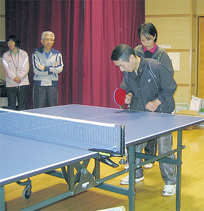 当日は、中高年層の男女を中心に7サークルから25組50人が参加。自己申告により初級、中級、上級に分かれてダブルス戦を行い、卓上でボールを打ち合いながら交流を深めていった。