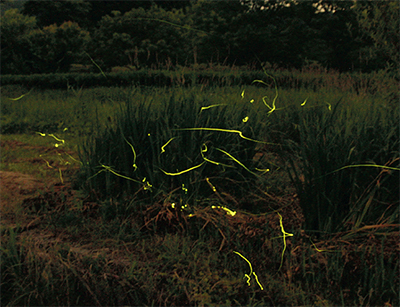 撮影日には数組の家族などが訪れ、なかには童謡「ほたるこい」を口ずさみながら、宵闇を舞うホタルを追いかける親子の姿も。