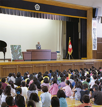 鶴巻小学校(府川幸生校長)が創立30周年を迎え、6月16日に初代校長の山田幸雄氏(82)を招いて、全校児童813人、教職員、保護者で30周年記念の全校集会を行った。
