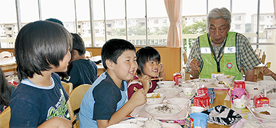 広畑小学校(北村芳子校長)で6月20日、下校時の防犯パトロールに感謝する目的で、下大槻団地長寿会(菊地繁雄会長)と児童が給食で交流する「ありがとう会食」が開催された。