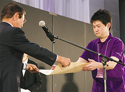 全国のフローリスト(花屋)が参加する花の祭典、フラワードリーム2012が6月30日、7月1日に東京ビックサイトで行われ、フローリストせきど(本店/柳町2の4の22)のチーフデザイナー飯野正永さん(31)が、「花キューピットグランプリ」でグランプリを受賞した。夏ギフトを題材に、商用作品80点が出品され、審査員と来場者投票によって総合審査された。