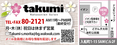イオン近くにあるハワイアンな癒しスポット、リラクゼーションサロン「takumi」が9月1日(土)、待望のリニューアルオープンを迎える。