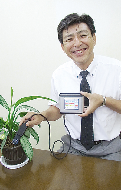 受賞した製品は、土壌の水分量や塩分濃度、温度等を計測する小型水分センサー(WD―3シリーズ)。従来は、針状の計測部を持つ外国製のものが多かったが、同社では、曲りなどに強い板状構造のセンサーを国内で初めて自社で独自開発。同等の外国製品に比べて低価格を実現させた。すでに全国の大学の農学部や農業関係の研究所、植物工場などで使用されている。