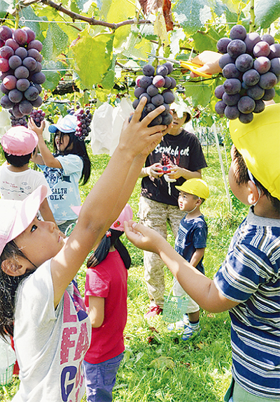 菖蒲の須藤ぶどう園(須藤政一代表)で9月15日、上小学校児童と上幼稚園園児がぶどう狩りを行った。