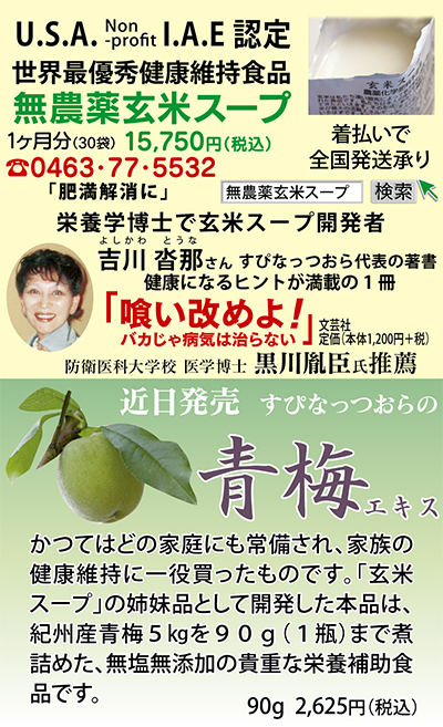 「玄米スープと梅干をいっしょに食べることで、体内に溜まっているヘドロや公害物質を体外に排出する効果が一層強化されますが、梅干に含まれる塩分や糖分が気になるので食塩無添加の青梅エキスを開発しました。昔から青梅は、便秘や下痢、血圧・糖尿病対策等々の妙薬として大変重宝されていました」
