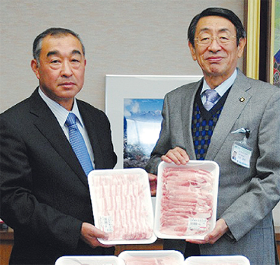 この日、市役所で古谷義幸市長に豚肉を手渡しながら門倉さんは、「毎年、施設の利用者には喜んでもらえる。豚肉はビタミンB1が豊富なので、肉をたくさん食べて風邪をひかないようにしてもらいたい」などと話した。
