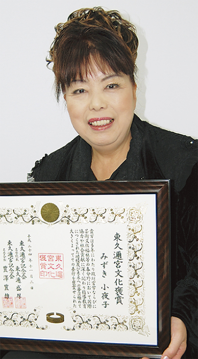 下大槻在住の演歌歌手みずき小夜子(本名・鈴木小夜子)さんが11月3日、東久邇宮文化褒賞を受賞した。芸術文化福祉等への功績に対して贈られた。