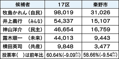 第46回衆議院選挙は16日に投開票され、接戦が予想された小選挙区神奈川第17区は新人の牧島かれん氏(自民)が次点の井上義行氏(みんな)に4万票以上の差をつけ前回の雪辱を果たした。牧島氏は秦野市内でも圧倒的な強さを見せた。2期目を目指した現職の神山洋介氏(民主)は政権交代旋風が吹き荒れた前回選挙で獲得した約14万票から3分の1に票数が激減し、議席を失った。