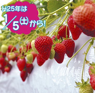 広さ13㌃、寒い冬でも暖かいハウスに足を一歩踏み入れると、中に漂うあまいイチゴの香り。もちろんベビーカーや車いすでも安心して楽しめる高設栽培だ。