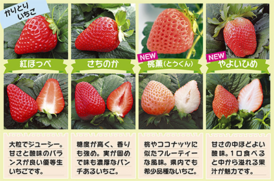 同園の魅力は何と言っても豊富な種類のイチゴ達。人気の「紅ほっぺ」「さちのか」に加え、スーパーでもなかなか見かけられない「やよいひめ」「桃薫」「おいCベリー」など様々な品種がたわわに実っている。どれも園主の片野さんが手塩にかけて育てたイチゴ、それぞれに魅力が異なる。是非この機会に味を食べ比べ「いちごソムリエ」の気分を楽しんでみてほしい。