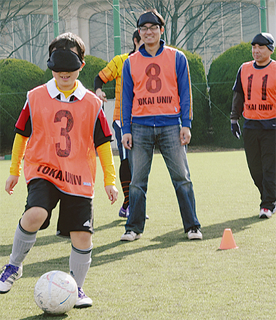 ブラインドサッカーとは視覚障がい者がプレイするパラリンピックの正式種目。選手は目隠しをして周りの声や鈴が入ったボールの音を頼りにプレイする。