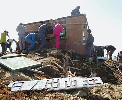 塔ノ岳山頂に立つ「日の出山荘」の解体作業が3月9日に行われた。