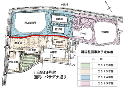 2014年度には陸上競技場、庭球場周辺とパサデナ通り、2015年度には公園北側駐車場の多目的広場を含む一帯と野球場周辺を整備予定。
