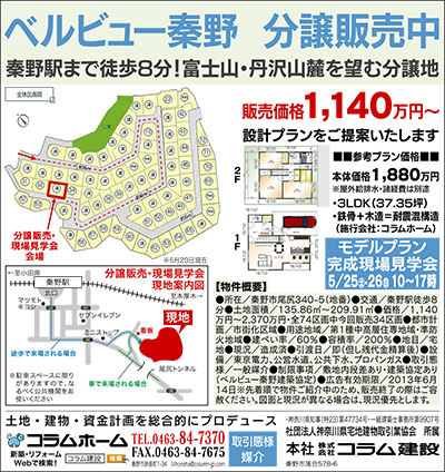 「自由設計の家を手ごろな価格で建てたい」。新築、リフォームから不動産販売まで、家づくりを総合的にプロデュースする地域密着の工務店『コラムホーム』が5月25日(土)・26日(日)、市内尾尻の分譲地「ベルビュー秦野」内で完成現場見学会を開催する。両日午前10時から午後5時まで。