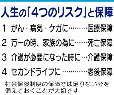A.人生の”4つのリスク”に備えるという点があげられます。保険というと生命保険(死亡保障)をイメージする方も多いですが、他に病気やケガ、介護や老後の生活を保障するものなどがあり、「社会保険制度」の保障で足りない分の備えにもなります。ただし、いざ保険が必要になった時、健康に不安があったり年齢が高かったりすると保険料が上がってしまうことも有ります。年齢や人生のステージに合わせて、バランスよく保険を組み合わせ、豊かなライフプランを考えてみてはいかがでしょうか」