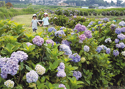 今年は雨が少なく、例年に比べると花の量は減少、色づきもまばらだという。同所にはセイヨウアジサイ、ガクアジサイ合わせて500株以上が植えられ、同散歩道美化の会(原秀夫会長)が4月から12月の間、毎月1回手入れをしている。