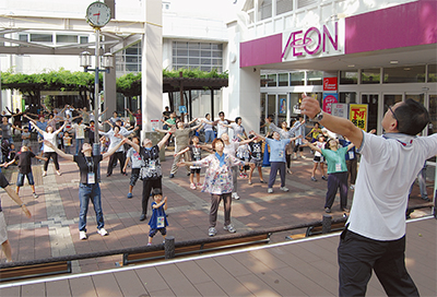 広場前のステージには同SC阪本正巳モールマネージャーとイオンフィットネススタジオのインストラクターがあがり、参加者はおなじみの伴奏に合わせてそろって手足を動かした。
