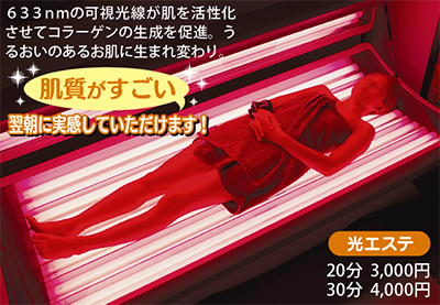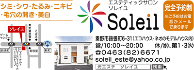 ソレイユでは、光エステを全身くまなく受けられる「コラーゲンエステティックマシン」を県西で初導入。中で心地よく寝ているだけで可視光線が肌の奥まで浸透し活性化。コラーゲンの生成を促して、肌本来の若々しさをよみがえらせます。同じマシンを体感した、テレビでおなじみのおネエ系教育評論家も「肌がぷるんぷるん、ツヤツヤよ!」と絶賛していたとか。「サラッとした汗を大量にかくので、サウナのような気持ちよさがあります。普段汗をかかない人にもおすすめですよ」とスタッフ。