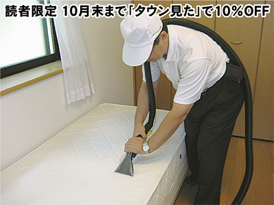 有名ホテルの清掃でも使用される強アルカリイオン水で布製品の奥の奥まで除菌・消臭。さらに吸引機でダニの死骸や微細な菌も徹底吸引洗浄。洗浄液の濁りを見て「こんな所で寝ていたの!?」と驚く人も。シングルベッド8400円〜、絨毯1平方メートル800円〜と健康を考えたら手頃な価格。「タウン見た」で特典も。