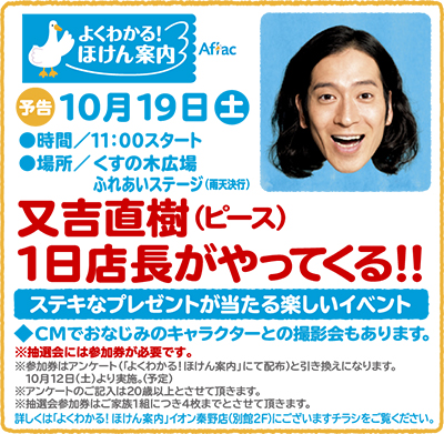 CMに出演しているアフラック(アメリカンファミリー生命保険会社)のイベント。場所は、くすの木広場ふれあいステージで時間は午前11時スタート。雨天決行。