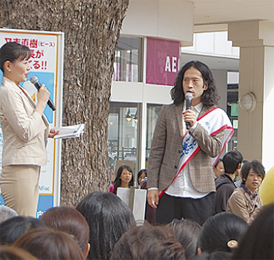 入船町のイオン秦野ショッピングセンターに10月19日、テレビでもおなじみの又吉直樹さん(ピース)が来店した。自身がCM出演している保険会社のPRイベントの一環。