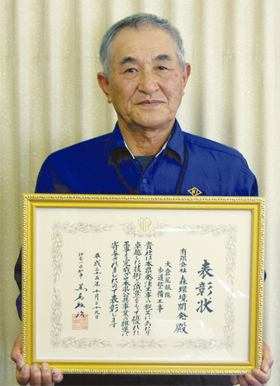 森環境開発は、工事等級別の地元活力部門で選ばれた。対象工事等名は大倉尾根線歩道整備工事。佐藤社長は、同工事の現場監督が30歳代の男性であることに触れ、「若い人たちが真剣に取り組んでいる仕事を評価していただき、大変嬉しく思います」と話した。