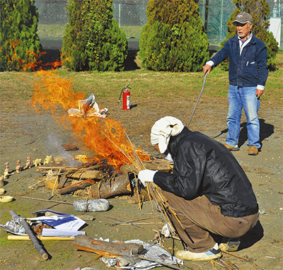 11月23日(株)島津製作所秦野工場臨時駐車場で、土器の野焼き体験学習が行われた。これはNPO法人秦野環境保全フォーラムが「秦野の縄文を遊び、縄文に学ぶ」をテーマに開催した講座の一環。この日は参加者らが事前に行われた体験学習のなかで製作した縄文土器を「野焼き」した。