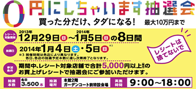 本日12月26日から専門店街の「イオン ザ・バーゲン」がスタート。続いて、年末年始のお買物が「最大10万円タダになる」かもしれない『0円にしちゃいます抽選会』も開催。12月29日〜1月5日の直営・専門店レシート合計5千円以上で1回参加。抽選は1月4日・5日、本館2階ガーデンコート前特設会場。