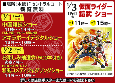 元日の「初売り」は朝8時スタート。さらに3が日、本館1階セントラルコートで多彩なショーが繰り広げられる。ハラハラドキドキの「中国雑技ショー(1日)」やテレビで大人気の「仮面ライダー鎧武(ガイム)ショー(3日)」などが観覧無料で楽しめる。詳しくはイオン秦野SC店頭またはHPで。