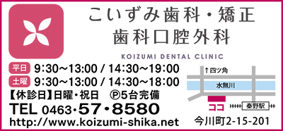 2月22日(土)午後2時30分から「歯科セミナー&治療相談」を開催する。参加費は無料。希望者は電話で予約を。小泉院長は「矯正、歯周病、入れ歯、インプラントなど子どもからお年寄りまで楽しめる幅広い内容です」と話している。
