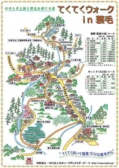 蓑毛地区の自然や史跡などを歩いて巡る、散策路マップ「てくてくウォークin蓑毛」がこのほど完成した。散策コース作りやマップ制作を手掛けた蓑毛地区活性化対策委員会(松下雅雄会長)は、「蓑毛の魅力をより広く知ってもらうきっかけになれば」と期待を寄せる。