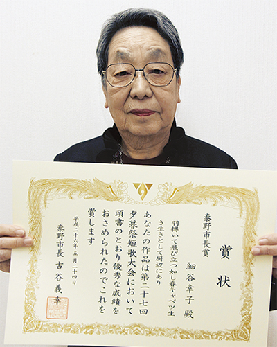 郷土の歌人・前田夕暮、谷鼎(かなえ)の文学遺産を長く受け継いでいくため、大人から子どもまで参加でき、全国から短歌作品を募集する「第27回夕暮祭短歌大会」(主催・秦野市、秦野市教育委員会)の表彰式が5月24日、市立図書館で行われ、最高賞の秦野市長賞に細谷幸子さん(88・南が丘在住)が選ばれた。