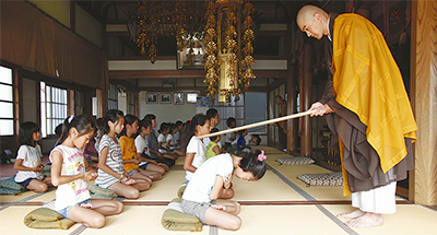 元気よく歩いてきた子も、座禅が始まると静まり返り、誰一人私語をせず真剣に取り組んでいた。指導は同寺の亮翔氏、亮全氏が務め、子ども一人一人の前に立ち、互いに一礼。子どもが身をかがめると叱咤激励の意味を込め、両肩を3回ずつ禅杖で叩いた。