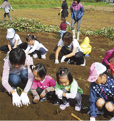当日、畑に集まったのは地元の幼稚園児や小中高生、保護者ほか200人以上。5月に苗の植え付けを行い、夏場の2回の草取りを経て、いよいよ待望の収穫。子どもたちは土を掘り返しながら、「大きいお芋があったよ」などと声をあげていた。