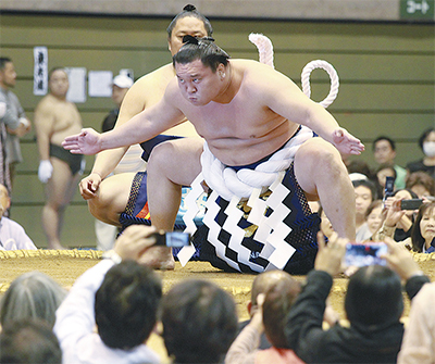 この日は上小学校児童が力士と土俵で稽古したり、幕内力士が土俵入りに合わせて赤ちゃんを抱っこするなど、本場所では見られないイベントも開催され会場は盛り上がりをみせた。