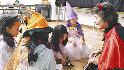 このイベントは、英会話を通して外国の祭事を体験するもの。子どもたちはクモの巣のマントをつけたりお化けの仮装をして参加し、英語のゲームやダンスなどを楽しんだ。特に同館職員らに「トリックオアトリート」と言ってお菓子を貰う企画は大好評。「たくさんお菓子をもらった」「楽しかった」と笑顔を見せた。